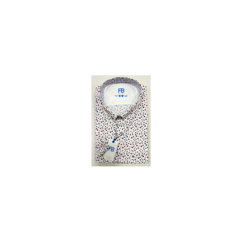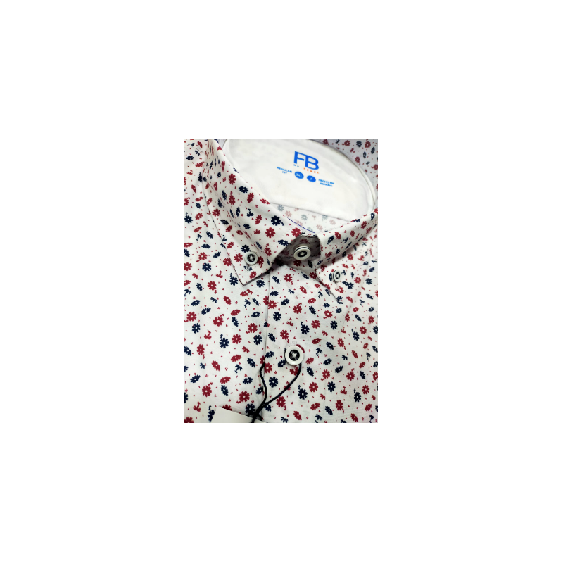 Camisa para hombre de manga corta estampada de pequeñas flores en marino y rojo ,el cuello con boton ,y bolsillo en el pecho.